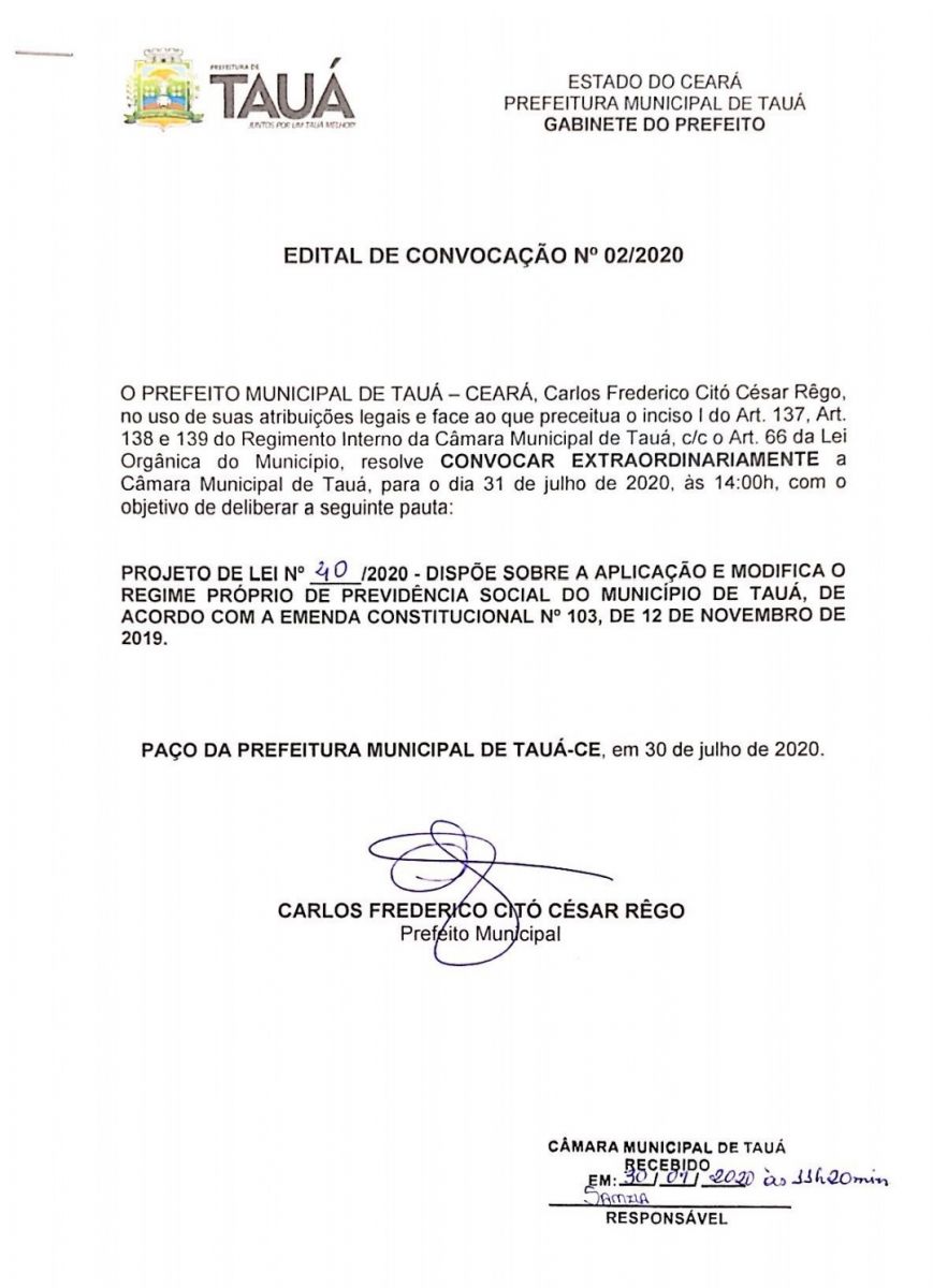 O prefeito de Tauá, Fred Rêgo(DEM) voltou a convocar a Câmara Municipal em caráter extraordinário, para votar o projeto que altera de 11% para 14% a alíquota de contribuição dos servidores municipais, adequando às legislações, federal e estadual.
