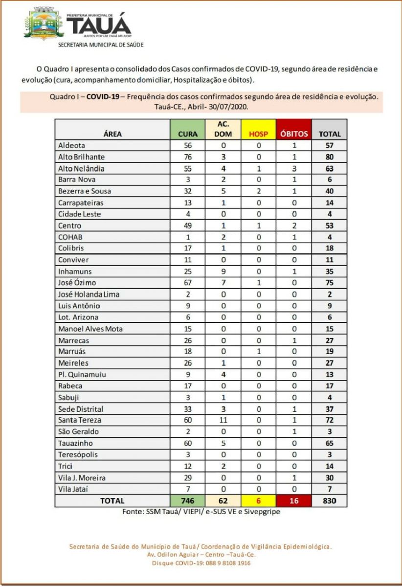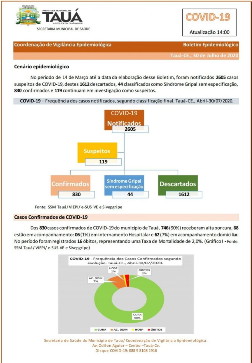 Um novo Boletim Epidemiológico divulgado na tarde de hoje(30) pela Secretaria de Saúde voltou a registrar aumento nos casos confirmados e de pacientes curados de coronavírus no município de Tauá.