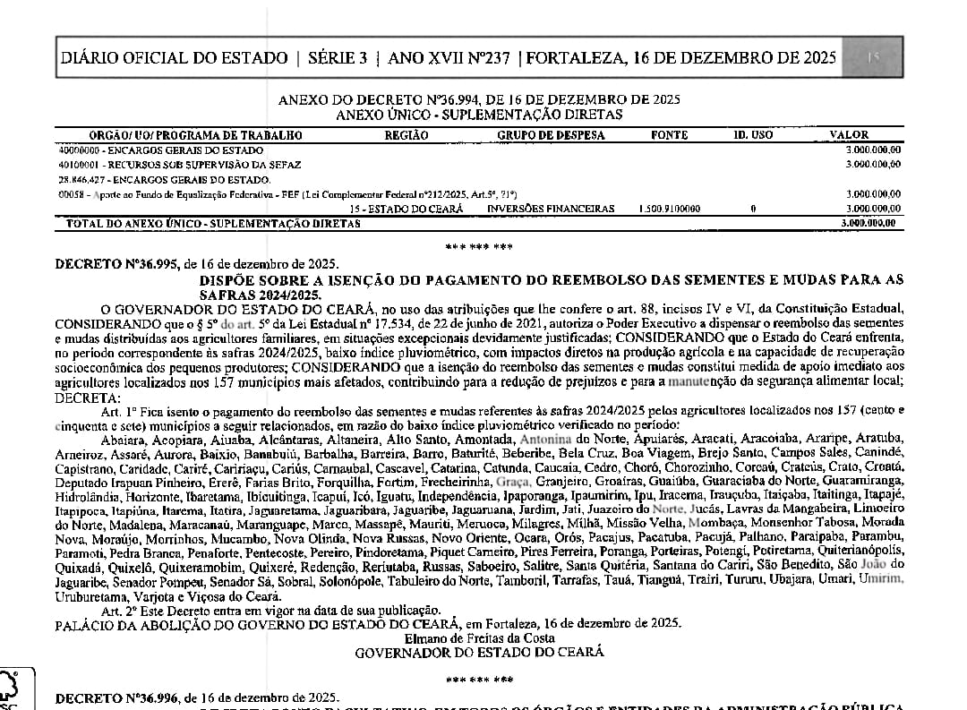 O Decreto assinado pelo Governador Elmano de Freitas, foi publicado na edição de ontem (16/12), do Diário Oficial do Estado e leva em consideração o baixo índice pluviométrico com impacto direto na produção agrícola e na capacidade de recuperação dos pequenos agricultores do Estado.