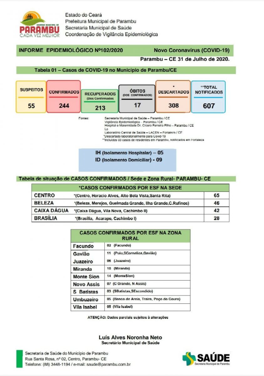 O boletim epidemiológico divulgado no final da tarde de hoje(31) pela Secretaria de Saúde de Parambu confirmou o 17º óbito por coronavírus no Município.