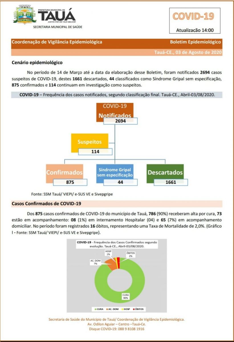Na manhã de hoje(04), a Secretaria de Saúde divulgou novo boletim epidemiológico sobre a situação da Covid-19 no município de Tauá.