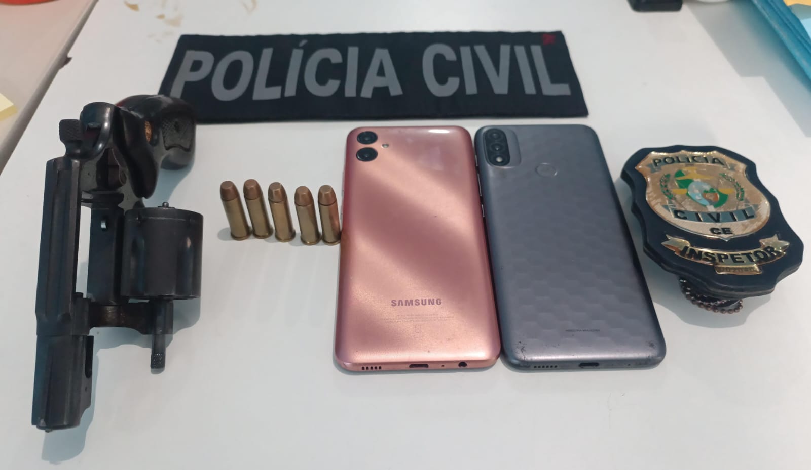 Segundo o Delegado, na cidade de Quiterianópolis foi preso Douglas Ryan de Souza Lopes, 21 anos, natural de Guaraciaba do Norte, que já tem várias passagens pela Polícia. Ele estava na posse de um revólver calibre 38 com a numeração suprimida e 5 munições intactas.