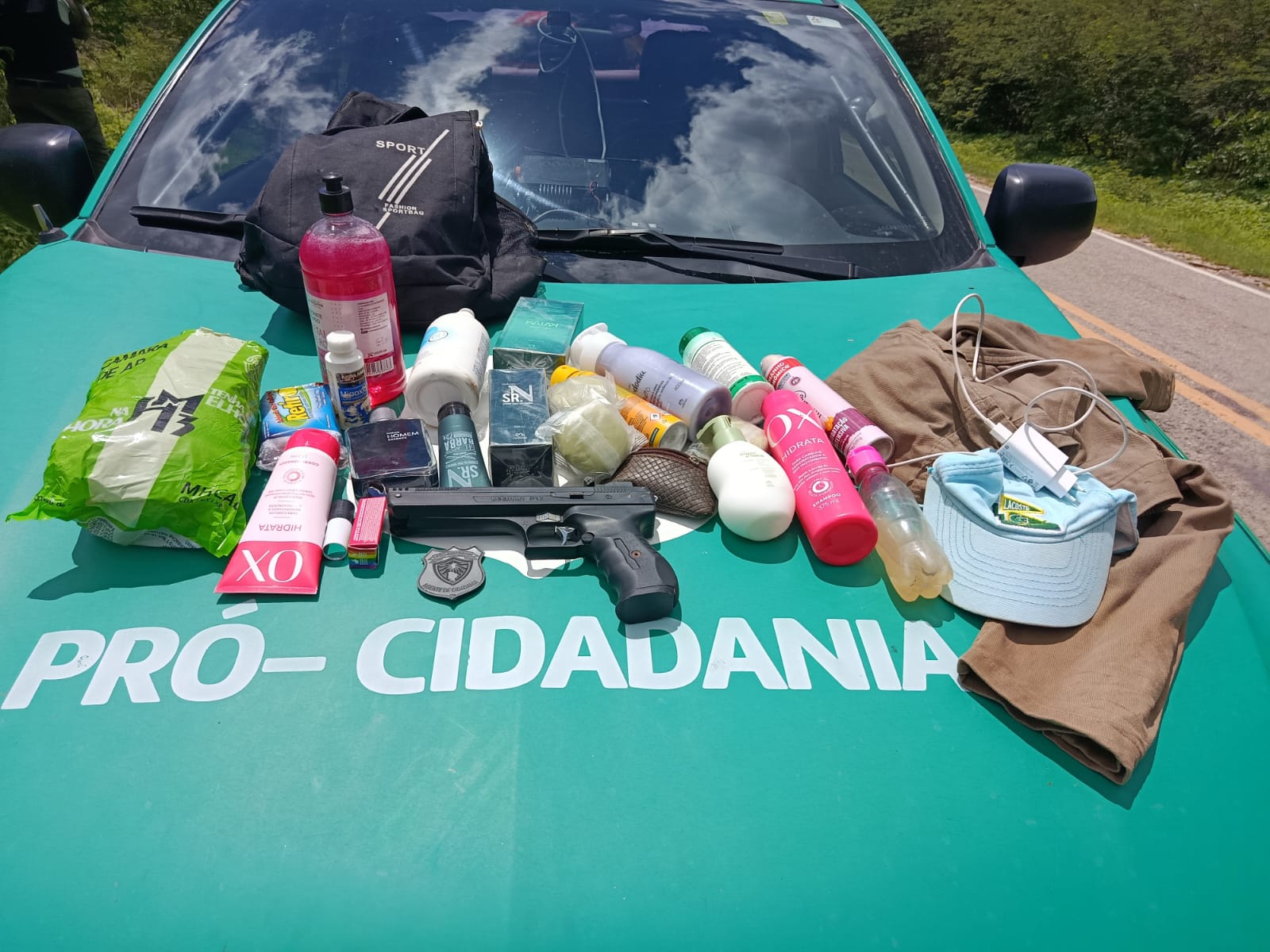 O Pró-Cidadania pediu o apoio do Polícia Militar, CPRaio e Guarda Municipal, que foram até ao local onde encontraram a moto Honda/CG Titan 125, cor vermelha, ano 1996, placa HVF-9701, com inscrição do município de Independência, e após uma varredura na área foram localizados, um capacete preto e uma mochila preta vários objetos, 1 pistola de pressão, diversos produtos de higiene e beleza, roupas, 1 carregador de celular tipo C branco e 1 bolsa pequena com moedas somando o valor de R$ 23,90.