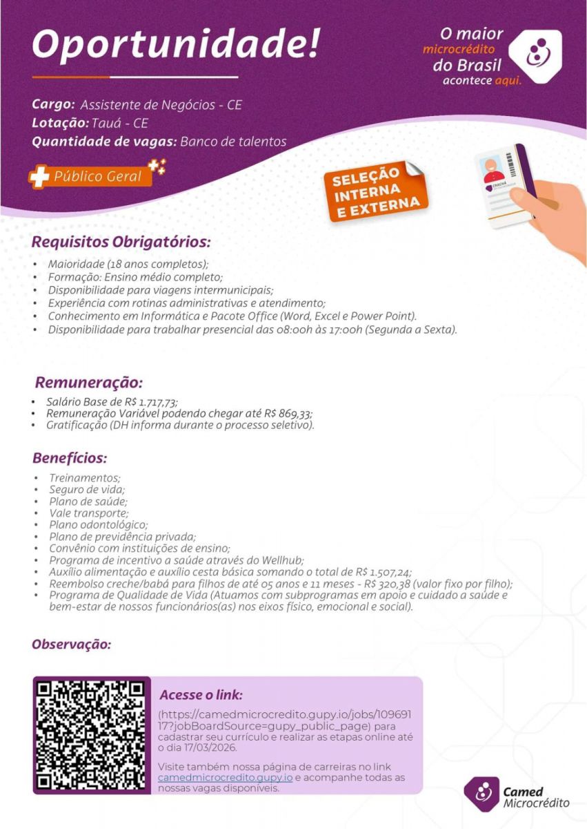 A vaga é para o cargo de Assistente de Negócios com salário base de R$ 1.717,73, remuneração variável podendo chegar até R$ 869,33, além de outras vantagens.