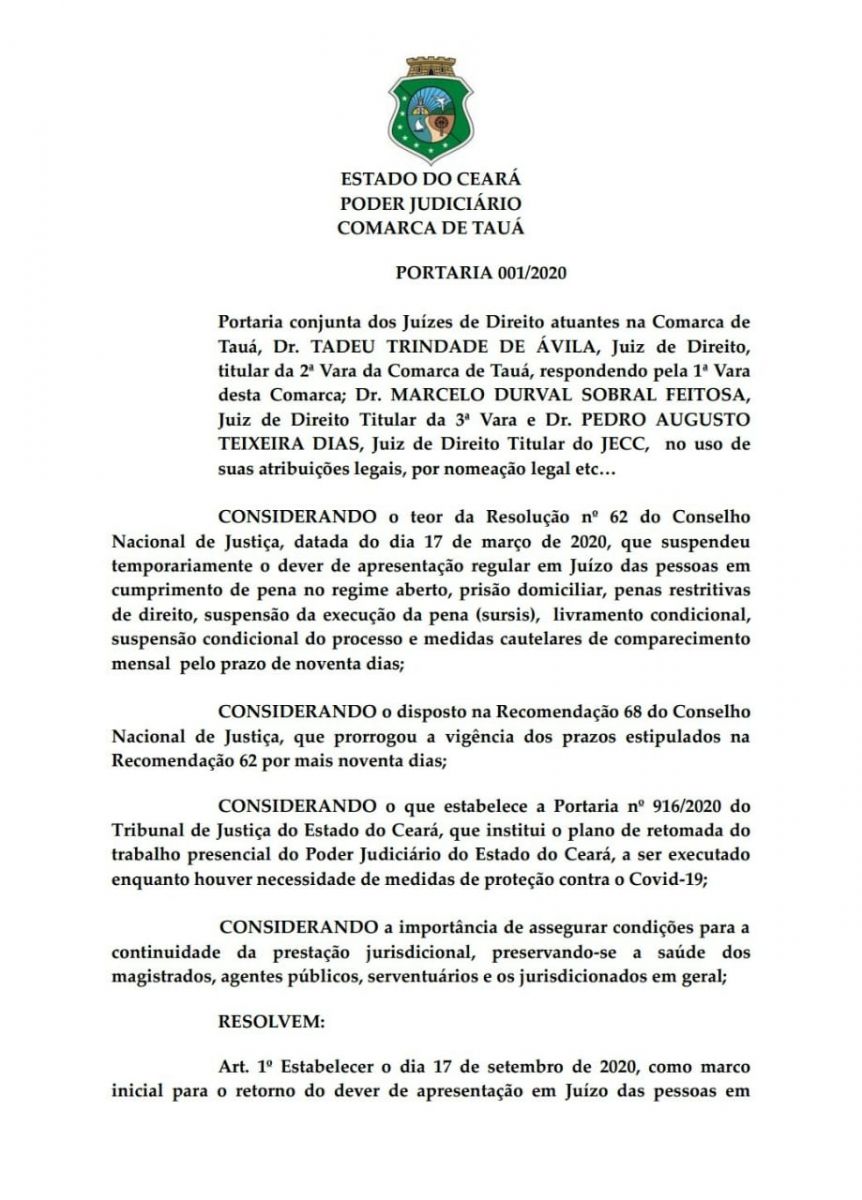 Portaria conjunta assinada pelos juízes da Comarca de Tauá determina o retorno das atividades presenciais no Fórum Dr. Fábio Augusto Moreira de Aguiar a partir da próxima quinta-feira(17).
