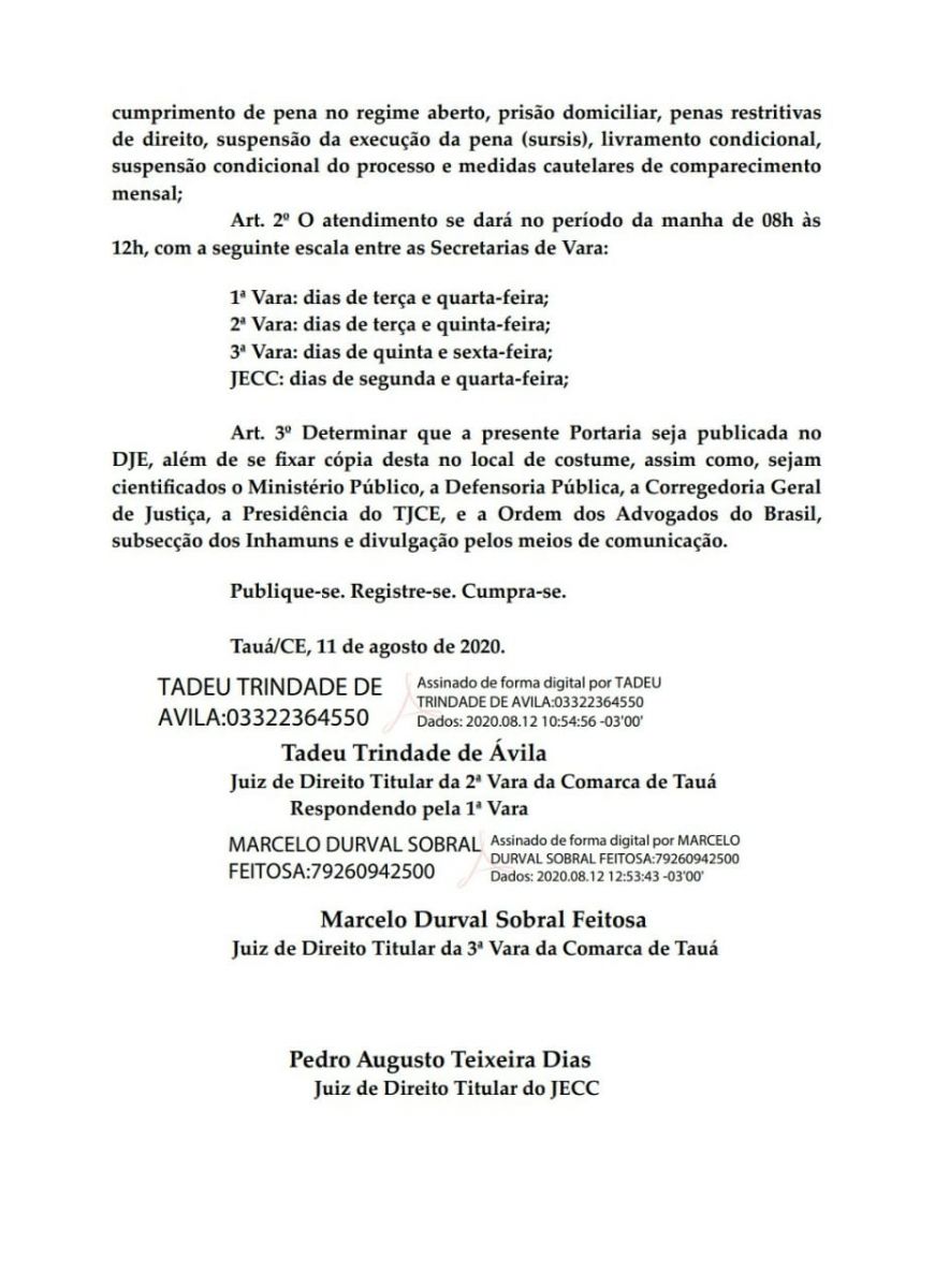 O documento foi emitido pelos magistrados, Dr. Tadeu Trindade de Ávila(2ª Vara e respondendo pela 1ª Vara), Dr. Marcelo Durval Sobral Feitosa(3ª Vara) e Dr. Pedro Augusto Teixeira Dias(Juizado Especial), estebelecendo que o atendimento, com restrições, ocorrerá se segunda a sexta, no horário de 8h às 12h, obedecendo uma escala.