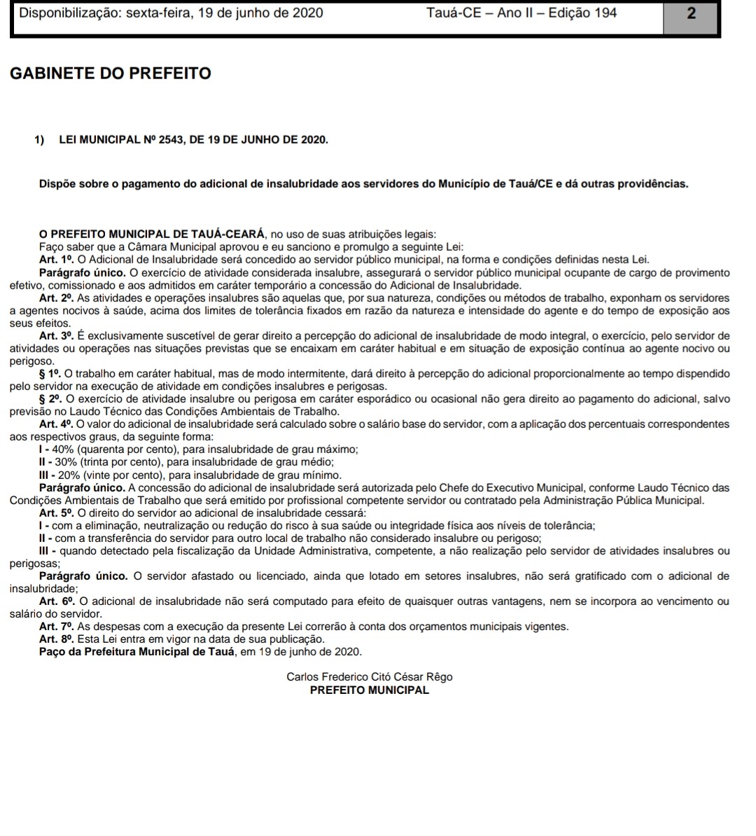 Profissionais que atuam nas unidades de saúde do município de Tauá tem cobrando insistentemente o cumprimento da Lei Municipal Nº 2543, de 19 de junho de 2020, aprovada pela Câmara Municipal, que dispõe sobre o pagamento do adicional de insalubridade aos servidores municipais.
