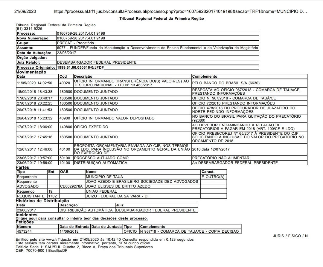Em 29 de junho de 2018, a Procuradoria Geral do Município de Tauá pediu habilitação no processo e logo depois solicitou a suspensão de quaisquer pagamentos ao Escritório ganhador do precatório.
