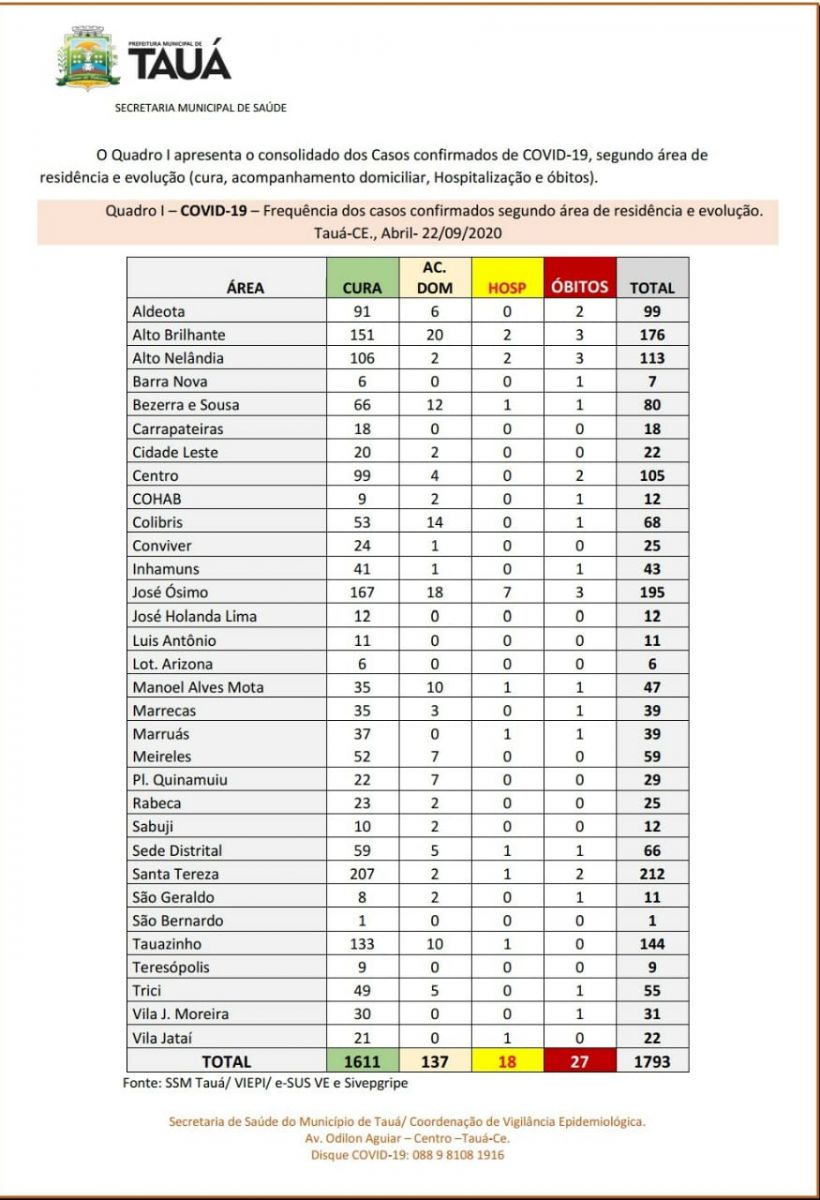Em mais um boletim epidemiológico divulgado na manhã de hoje(23), a Secretaria de Saúde confirma o 27º óbito por coronavírus no município de Tauá. A vítima residia no distrito de Trici, que registra a primeira morte pela doença, com 55 casos confirmados e 45 pacientes já curados.