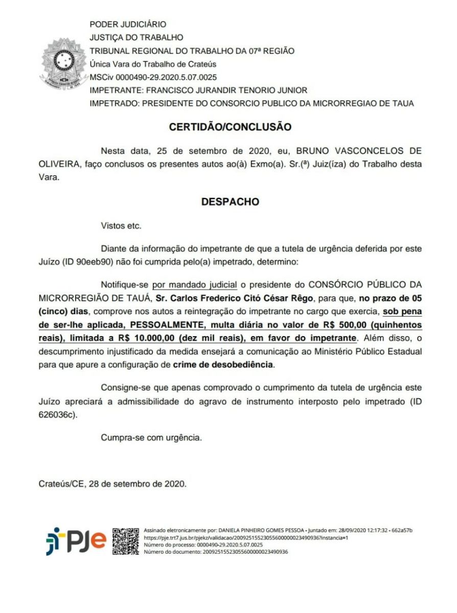 A Justiça do Trabalho de Crateús foi comunicada pela advogada Dra. Ana Paula Torres, que a decisão ainda não foi cumprida e na tarde de hoje(28), em outro despacho, determinou um novo prazo de 5 dias para o prefeito de Tauá comprovar a reintegração do advogado Dr. Jurandir Jr. ao cargo de Procurador do Consórcio de Saúde, sob pena de pagamento de multa diária a pessoa do gestor no valor de R$ 500 a R$ 10 mil.