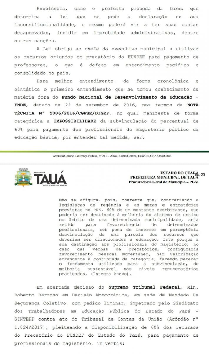 A ação se refere inclusive a uma decisão de um ministro do STF, considerada acertada pela Prefeitura de Tauá, contrária a um pleito liminar em favor da garantia dos 60% dos precatórios em favor dos professores. "Em acertada decisão do Supremo Tribunal Federal, Min. Roberto Barroso em Decisão Monocrática, em sede de Mandado De Segurança Coletivo, com pedido liminar, impetrado pelo Sindicato dos Trabalhadores em Educação Pública do Estado do Pará – SINTEPP contra ato do Tribunal de Contas da União (Acórdão nº 1.824/2017), pleiteando a disponibilização de 60% dos recursos do Precatório do FUNDEF do Estado do Pará, para pagamento de profissionais do magistério", diz trecho da ação do prefeito.