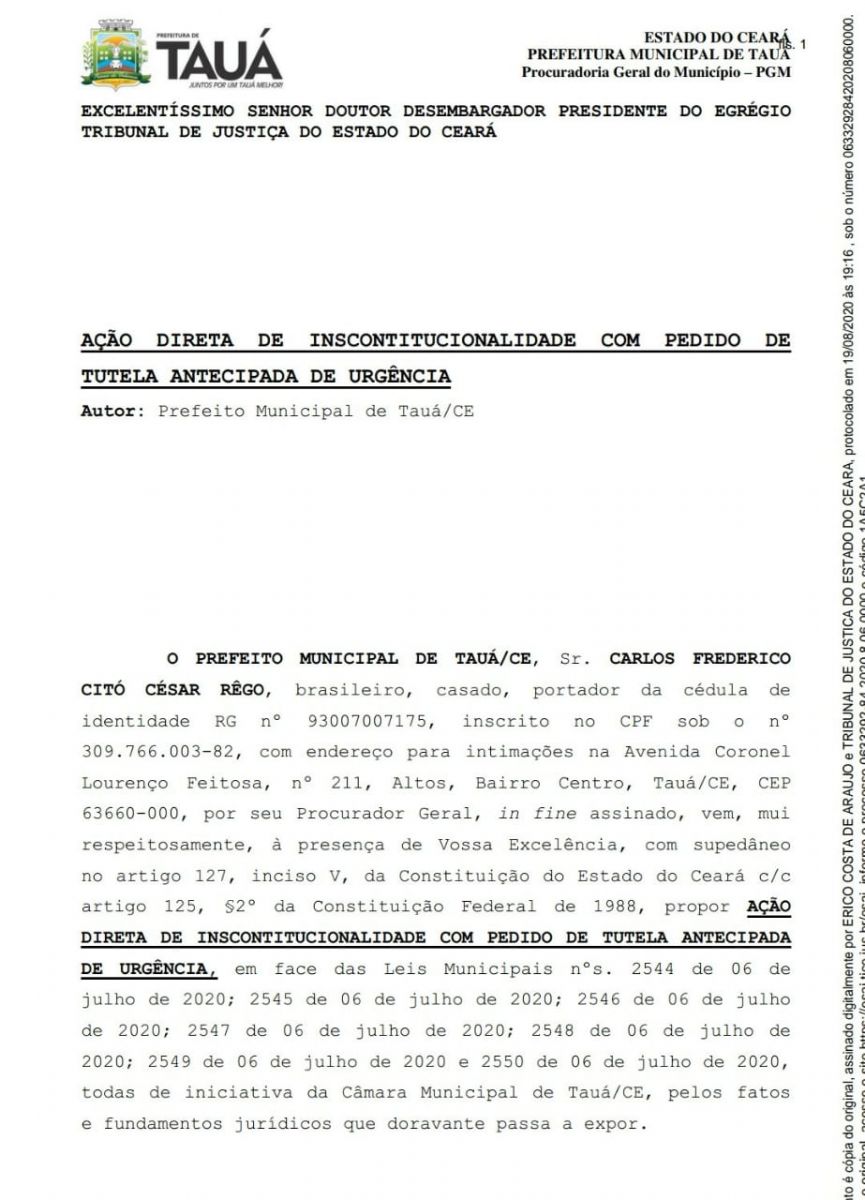 Trecho da Ação Direta de Inconstitucionalidade proposta pelo prefeito de Tauá, Fred Rêgo