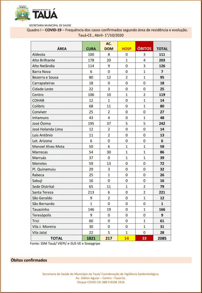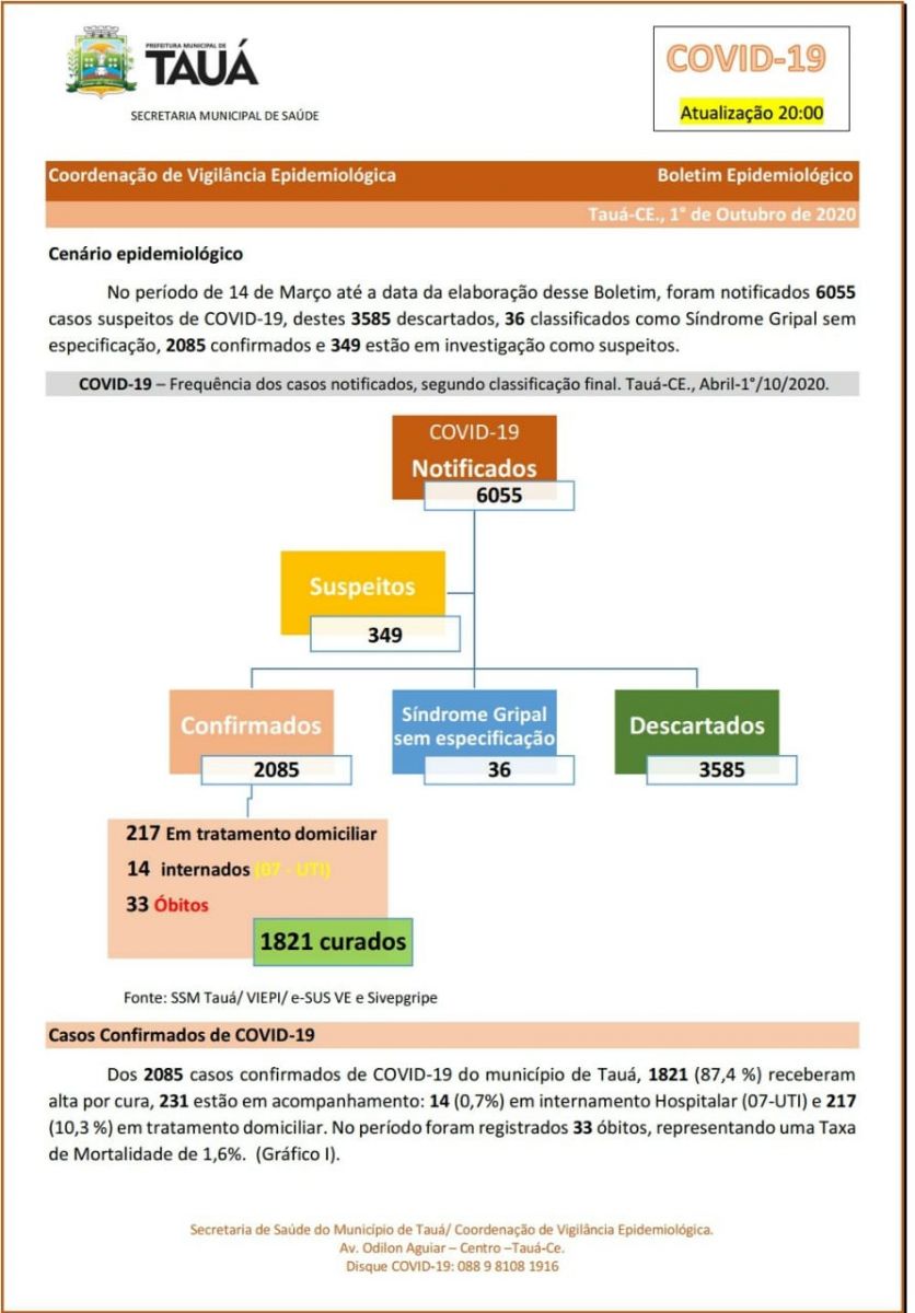A Secretaria de Saúde atualizou na manhã de hoje(02), os números da pandemia da Covid-19 no município de Tauá.