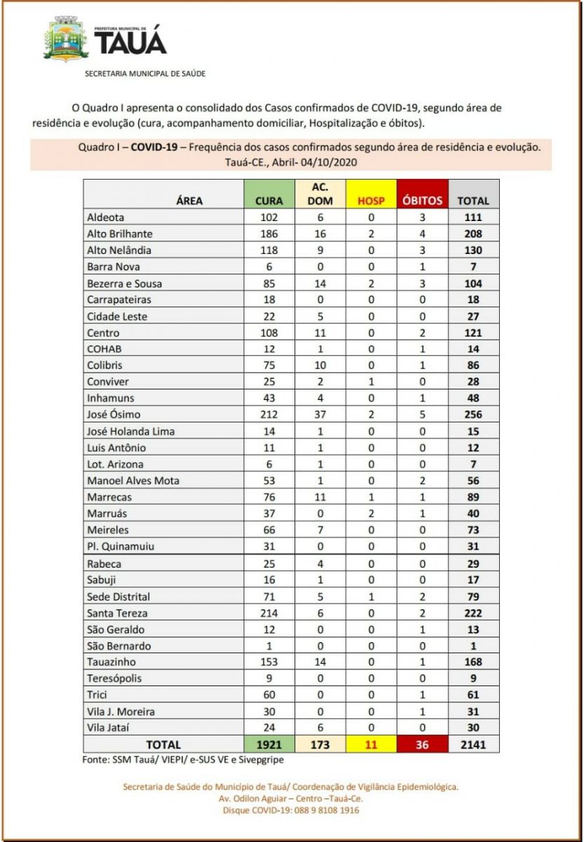 Com mais duas mortes ocorridas no final de semana, o município de Tauá contabiliza 36 óbitos por coronavírus, segundo o boletim epidemiológico divulgado pela Secretaria de Saúde na manhã de hoje(05).