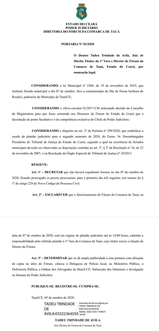 Uma Portaria assinada hoje(05) pelo Juiz Dr. Tadeu Trindade de Ávila, decretou que não haverá expediente no Fórum Dr. Fábio Augusto Moreira de Aguiar nesta quarta-feira(07), dia dedicado a Padroeira de Tauá Nossa Senhora do Rosário.