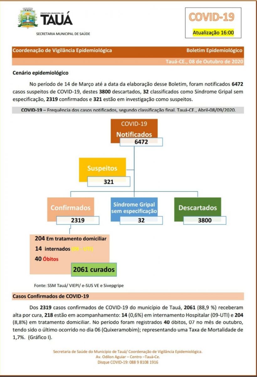 A Secretaria de Saúde confirmou hoje(09), o registro da 40º óbito por coronavírus no município de Tauá, segundo o boletim epidemiológico atualizado às 16h desta quinta-feira(08). O paciente residia na vila de Marrecas e faleceu no Hospital Regional de Quixeramobim na última terça-feira(06).