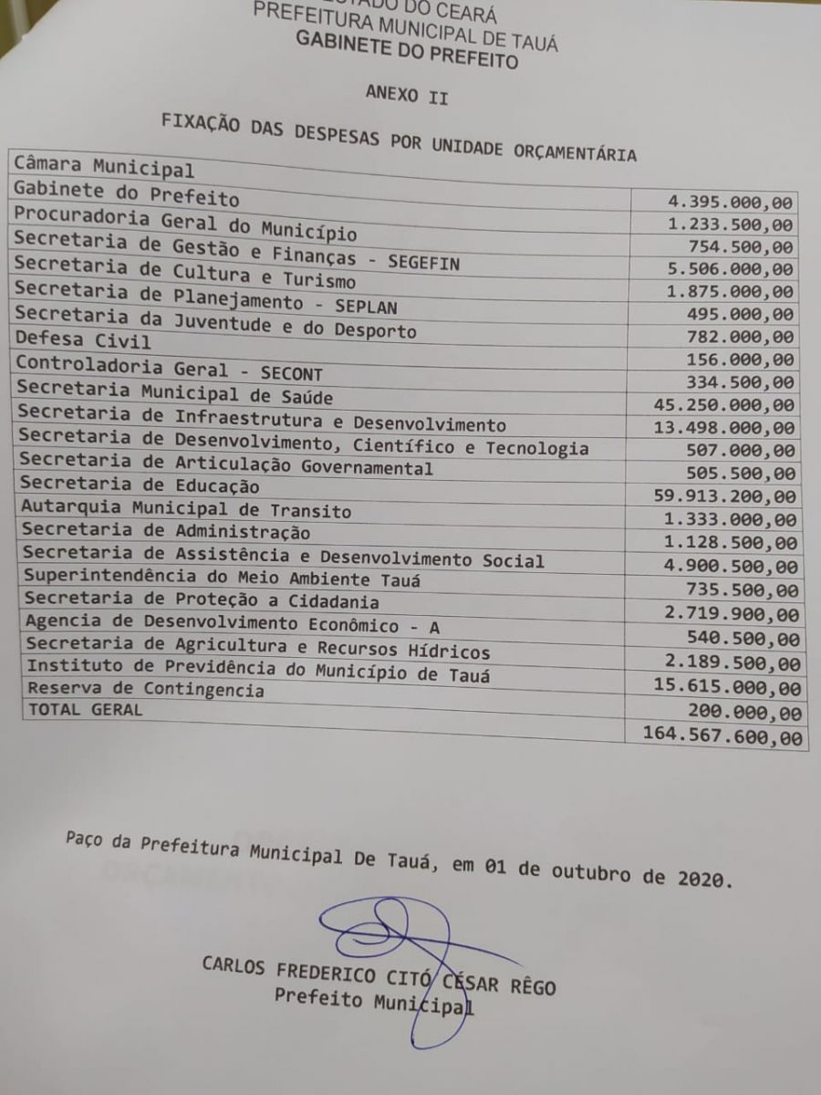 Os vereadores do municipio aprovaram na sessão ordinária desta segunda-feira(26), o orçamento da Prefeitura e Câmara de Tauá para o exercício financeiro de 2021.