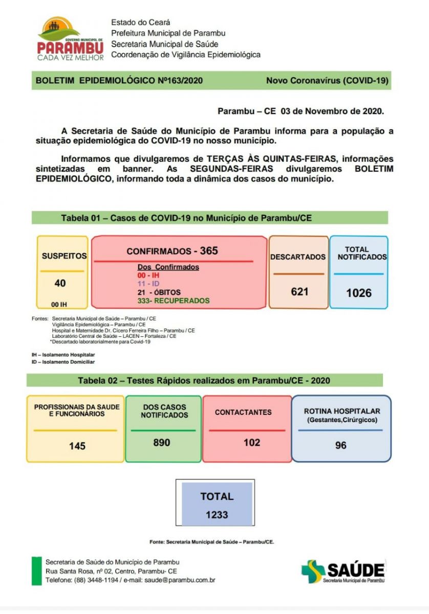 O 21º óbito por corovírus foi confirmado pela Secretaria de Saúde do Município de Parambu, por meio de boletim divulgado na manhã de hoje(04).