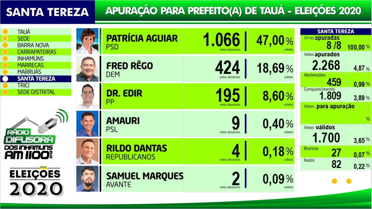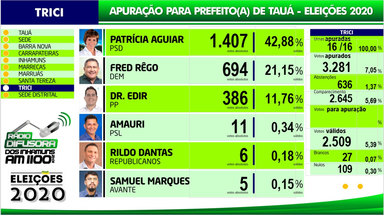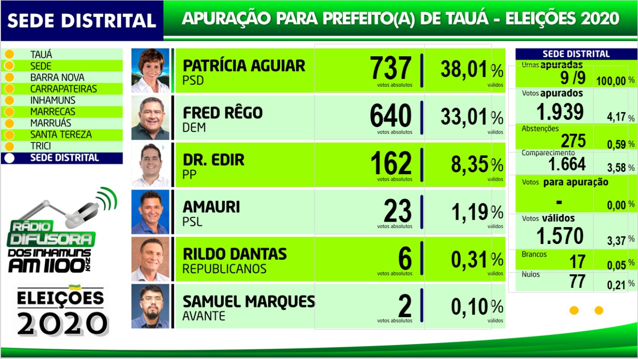 Confira os resultados da apuração das eleições para Prefeito de Tauá por distrito na apuração paralela realizada pela Rádio Difusora dos Inhamuns, ressaltando que podem ocorrer pequenas alterações em relação ao resultado oficial do TRE, mas que não influem no resultado geral.