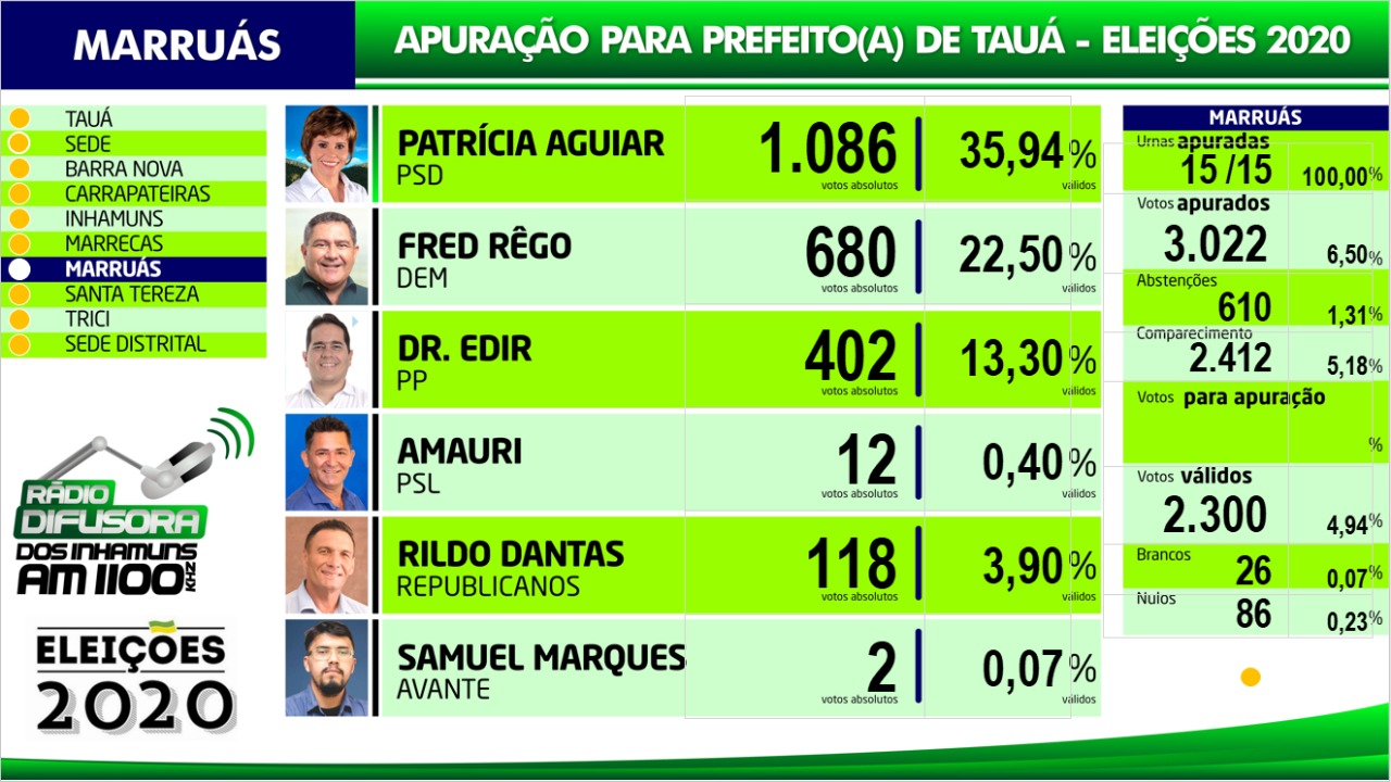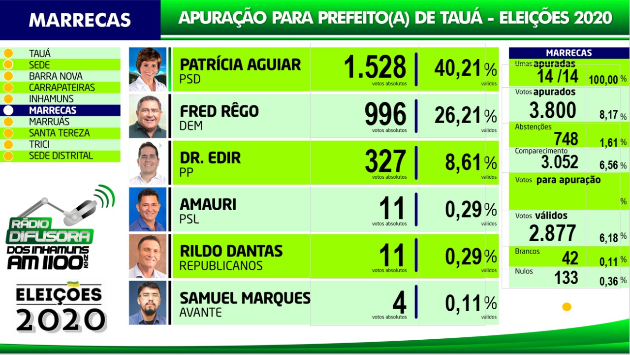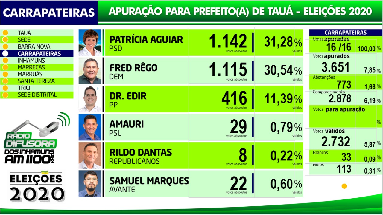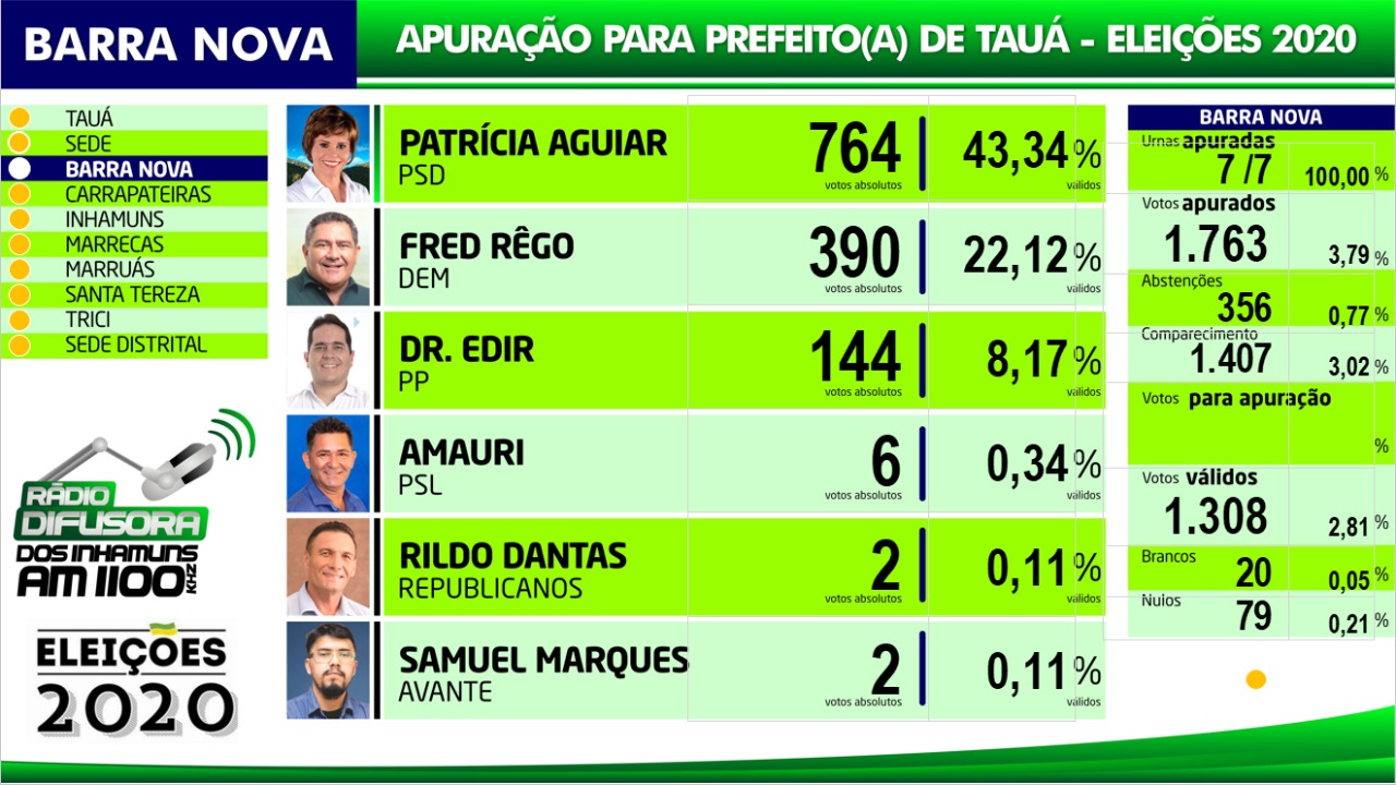 Confira os resultados da apuração das eleições para Prefeito de Tauá por distrito na apuração paralela realizada pela Rádio Difusora dos Inhamuns, ressaltando que podem ocorrer pequenas alterações em relação ao resultado oficial do TRE, mas que não influem no resultado geral.
