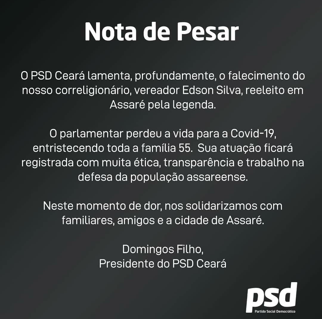 O Presidente do PSD do Ceará, Domingos Filho, divulgou Nota de Pesar pelo falecimento do vereador Edson Silva.