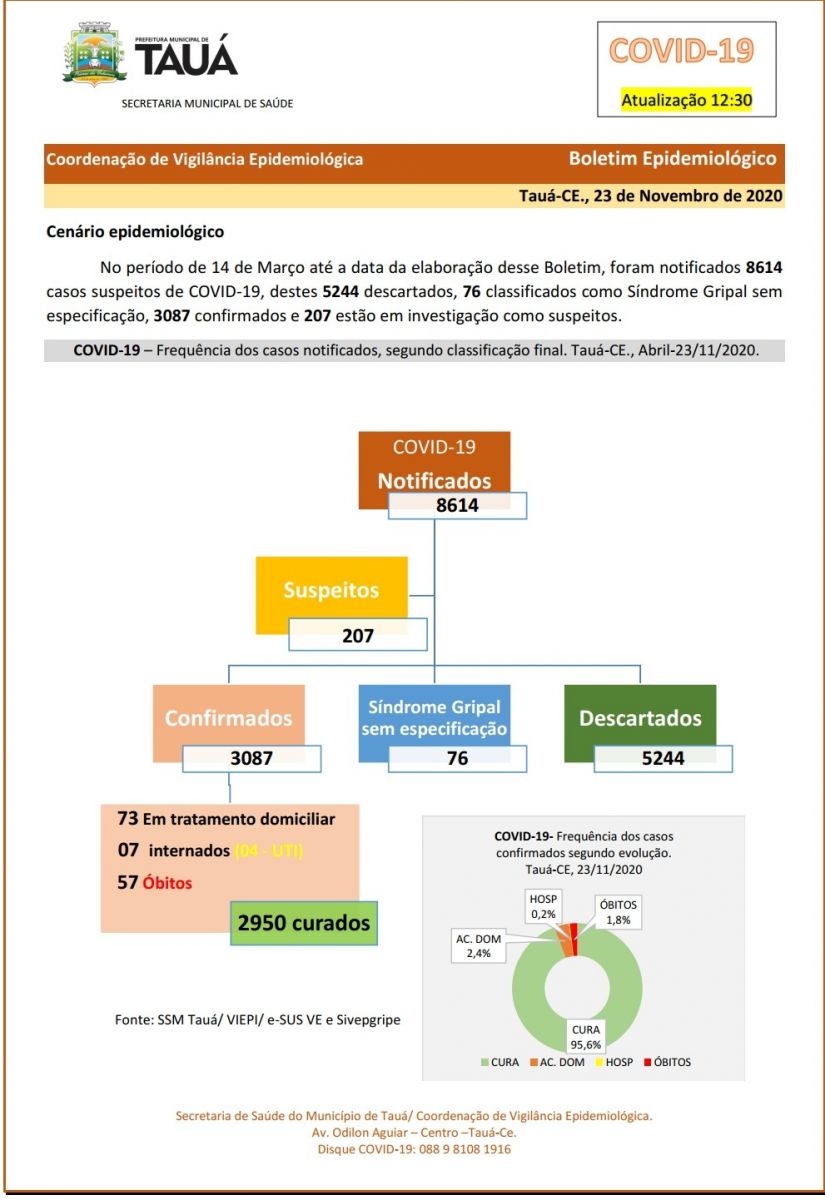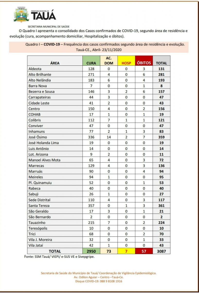 A Secretaria de Saúde atualizou no início da tarde de hoje(23), o boletim epidemiológico do coronavírus no município de Tauá.