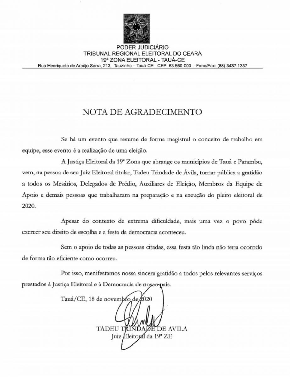 O Juiz Eleitoral da 19ª zona, Dr. Tadeu Trindade de Ávila divulgou Nota de Agradecimento ao pessoal que trabalhou nas eleições 2020 nos municípios de Tauá e Parambu.