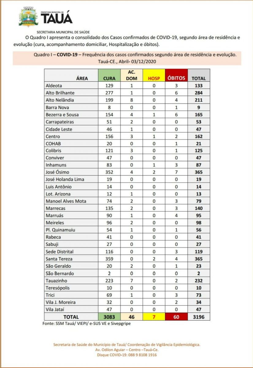 A Secretaria de Saúde atualizou o boletim epidemiológico sobre a situação da Covid-19 no município de Tauá. Os números são das 19h do último sábado(05) e não registram óbitos nessa primeira semana de dezembro.
