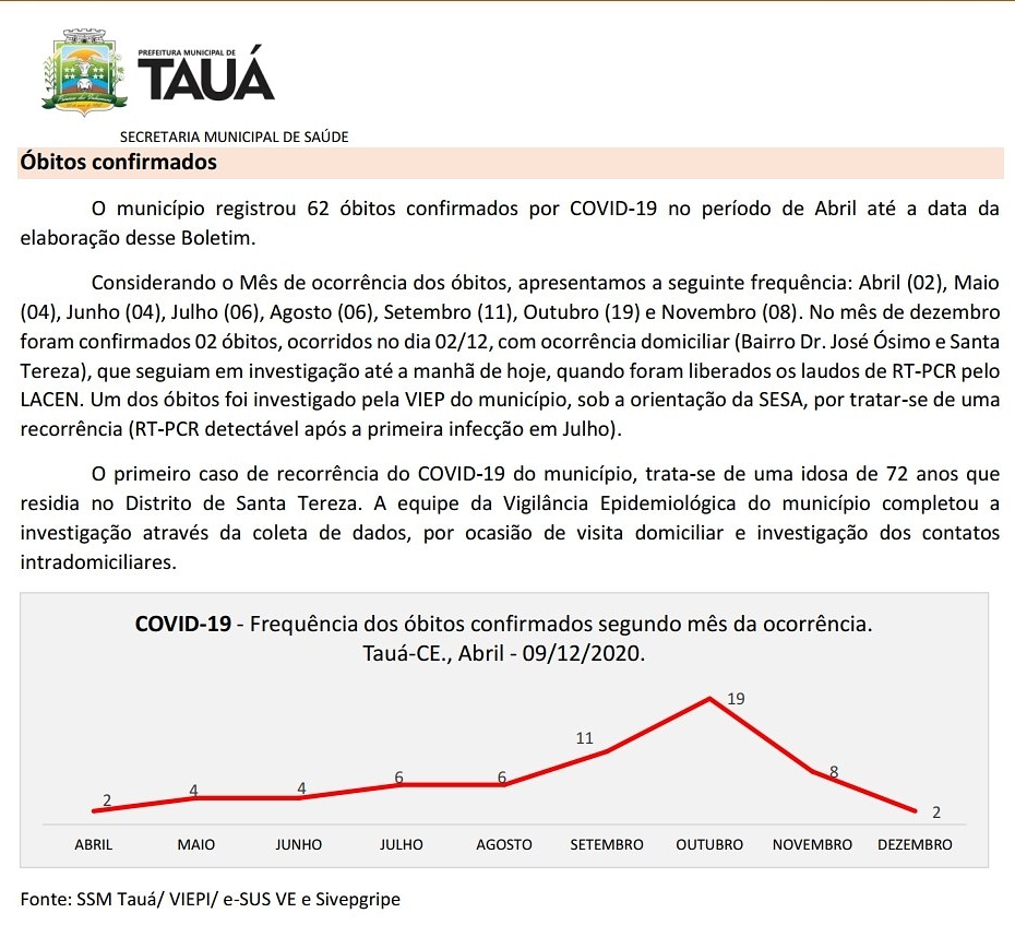 "No mês de dezembro foram confirmados 02 óbitos, ocorridos no dia 02/12, com ocorrência domiciliar (Bairro Dr. José Ósimo e Santa Tereza), que seguiam em investigação até a manhã de hoje(09), quando foram liberados os laudos de RT-PCR pelo LACEN.