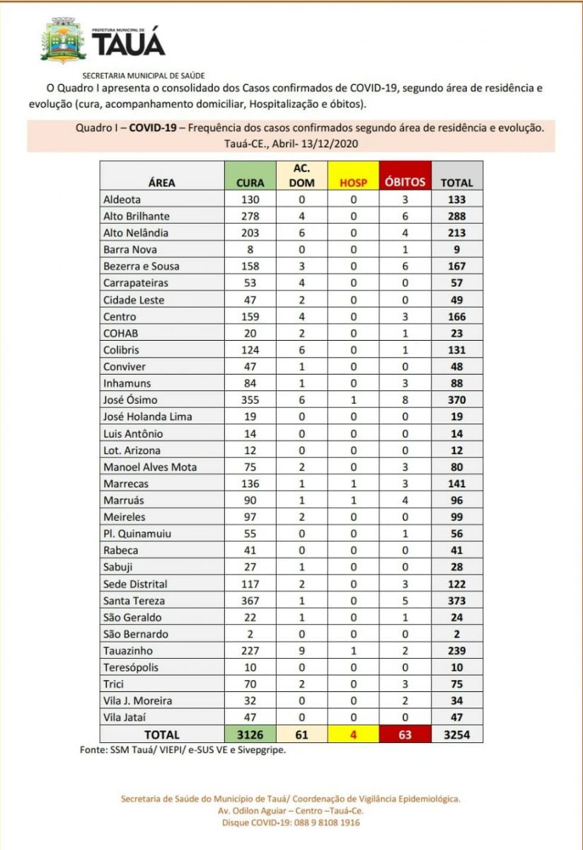 O 63º óbito por corovírus foi confirmado pela Secretaria de Saúde do Município de Tauá, em boletim atualizado às 20h de ontem(13). A morte da paciente ocorreu no Hospital Regional do Sertão Central, em Quixeramobim.