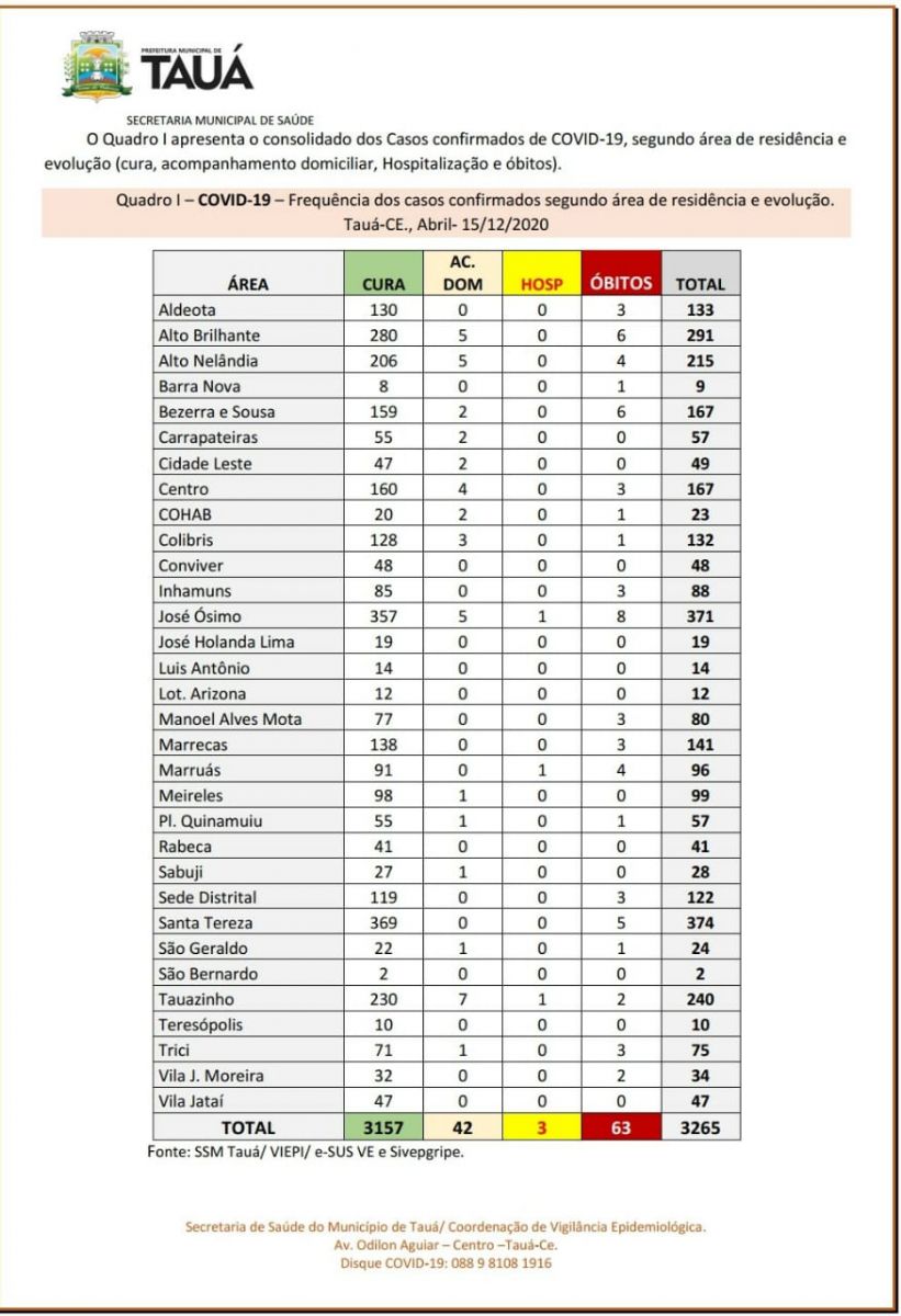 A Secretaria de Saúde divulgou um novo boletim epidemiológico atualizando os números da pandemia do coronavírus no município de Tauá.