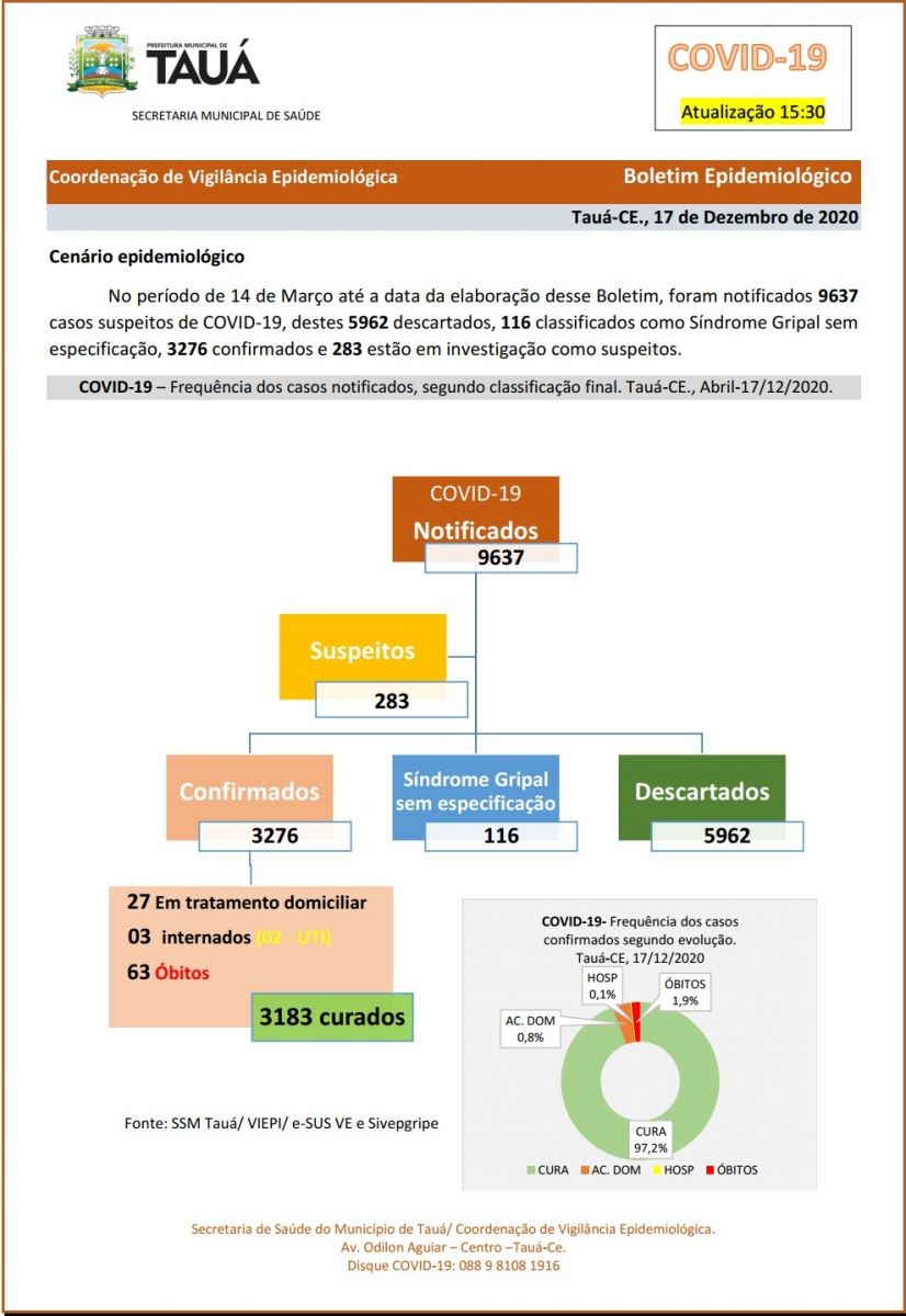 A Secretaria de Saúde divulgou mais um boletim epidemiológico atualizando os números da pandemia do coronavírus no município de Tauá, nesta quinta-feira(17).