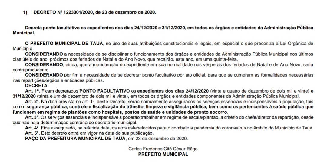 Decreto assinado pelo prefeito de Tauá, Fred Rêgo, estabeleceu o ponto facultativo nas repartições públicas municipais nos dias 24 e 31 de dezembro, vésperas do Natal e Ano Novo.