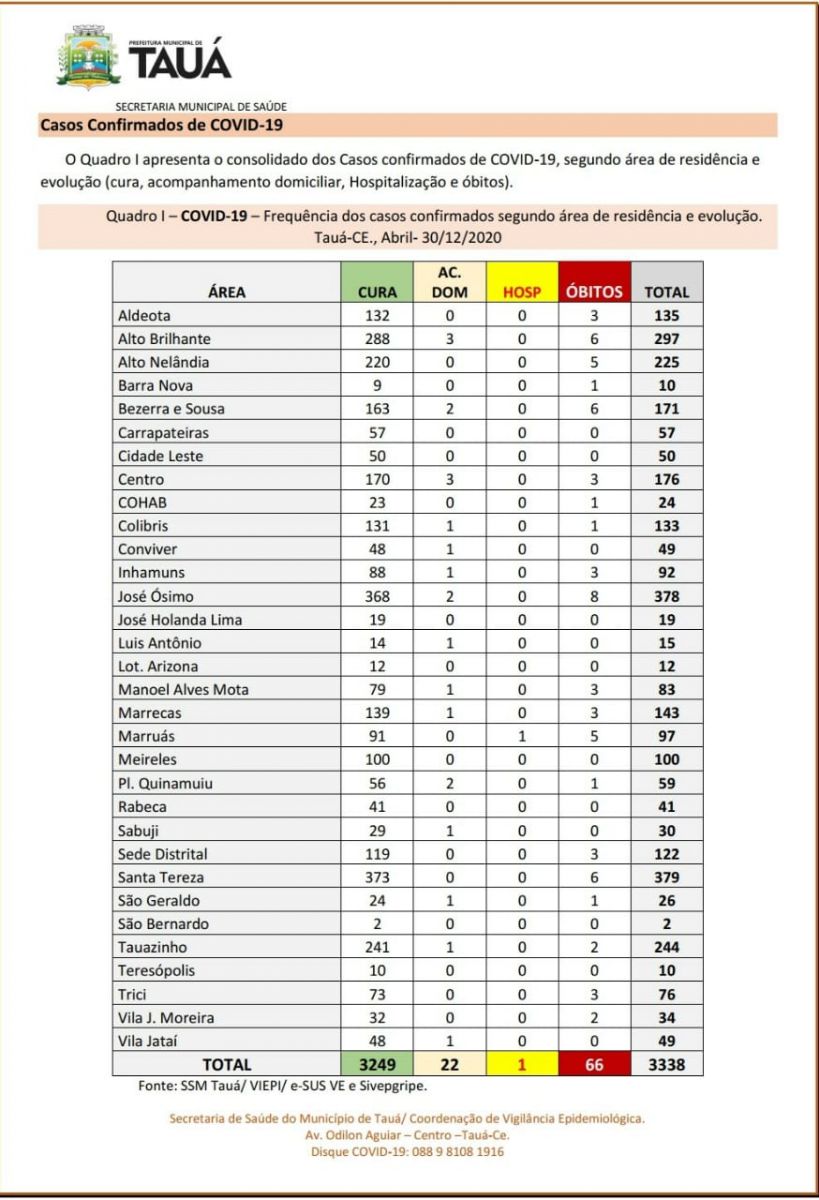 Boletim epidemiológico divulgado no início da tarde de hoje(31), contabiliza mais duas mortes por coronavírus no município de Tauá, atingindo a 66 óbitos ao longo da pandemia.