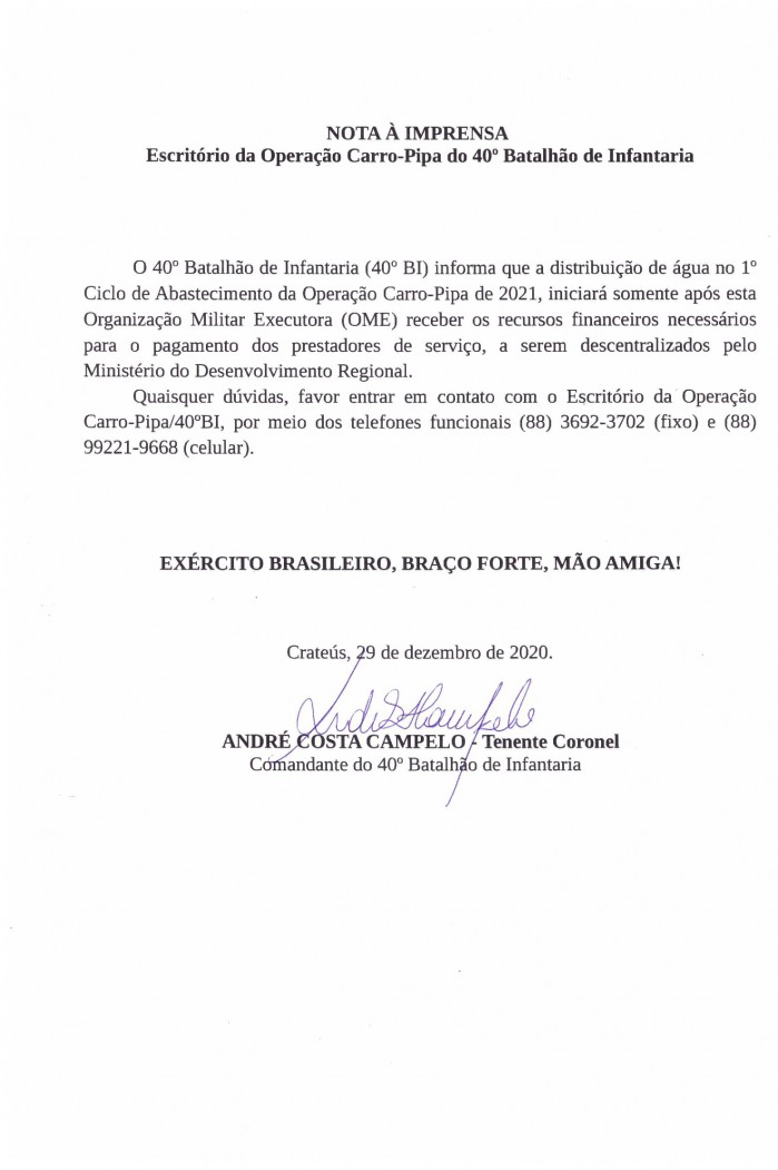 A nota em questão teria sido emitida pelo 40º BI, divulgada no site do Batalhão - por onde o Sinpece diz que teve ciência. A entidade repassou cópia do documento ao O POVO. É datado de 29 de dezembro último. Um trecho diz: "a distribuição de água no 1º Ciclo de Abastecimento da Operação Carro-Pipa de 2021 iniciará somente após esta organização militar executora (OME) receber os recursos financeiros necessários para o pagamento dos prestadores de serviço".