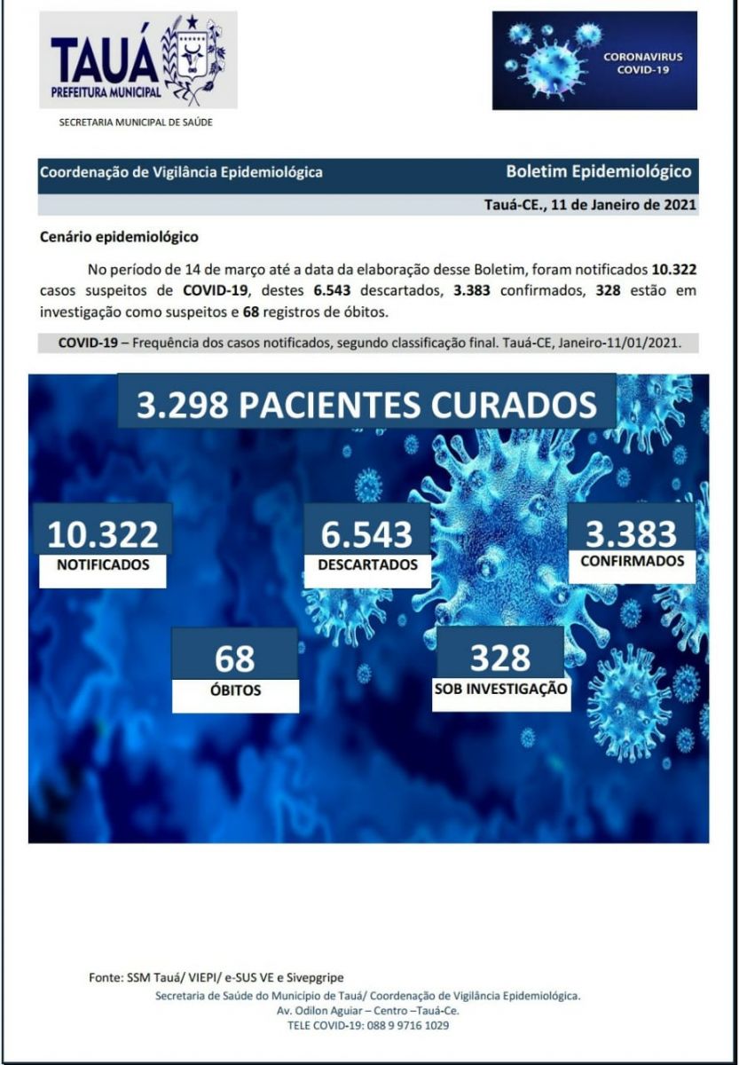 A Secretaria de Saúde do município de Tauá atualizou os números da pandemia da Covid-19 nesta segunda-feira(11). No período de 14 de março até ontem(11), foram notificados 10.322 casos suspeitos de COVID-19, destes 6.543 descartados, 3.383 confirmados, 328 estão em investigação como suspeitos e 68 registros de óbitos. Os pacientes curados somam 3.298.