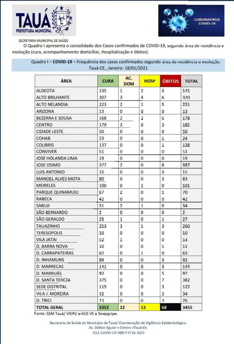 A Secretaria de Saúde divulga um novo boletim epidemiológico atualizando os números da pandemia do coronavírus no município de Tauá.