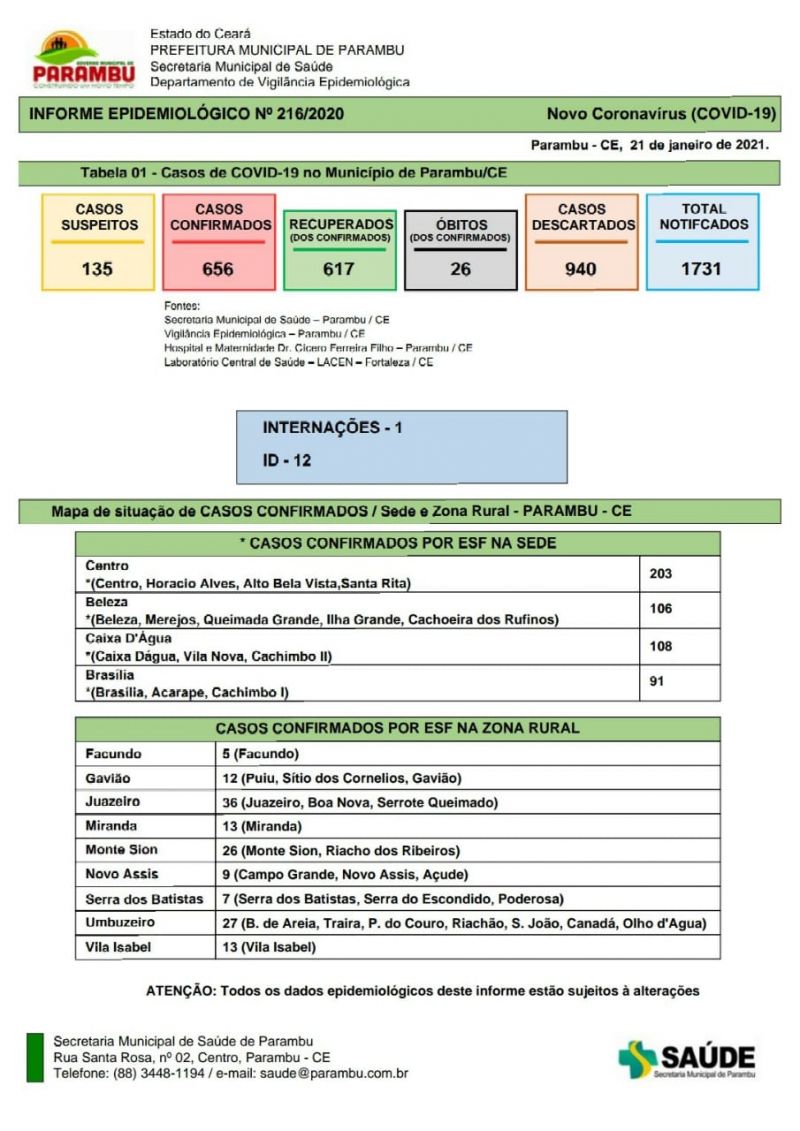"Nosso município apresenta o menor índice de mortes por coronavírus na Região dos Inhamuns e continuaremos trabalhando para que esse quadro se estabilize, mas a população precisa colaborar seguindo as orientações dos protocolos sanitários", disse o prefeito Ramilson Moraes, acrescentando que "esperamos a chegada de mais doses de vacinas nas próximas semanas para iniciarmos a imunização dos idosos e demais faixas etárias da população", finalizou.