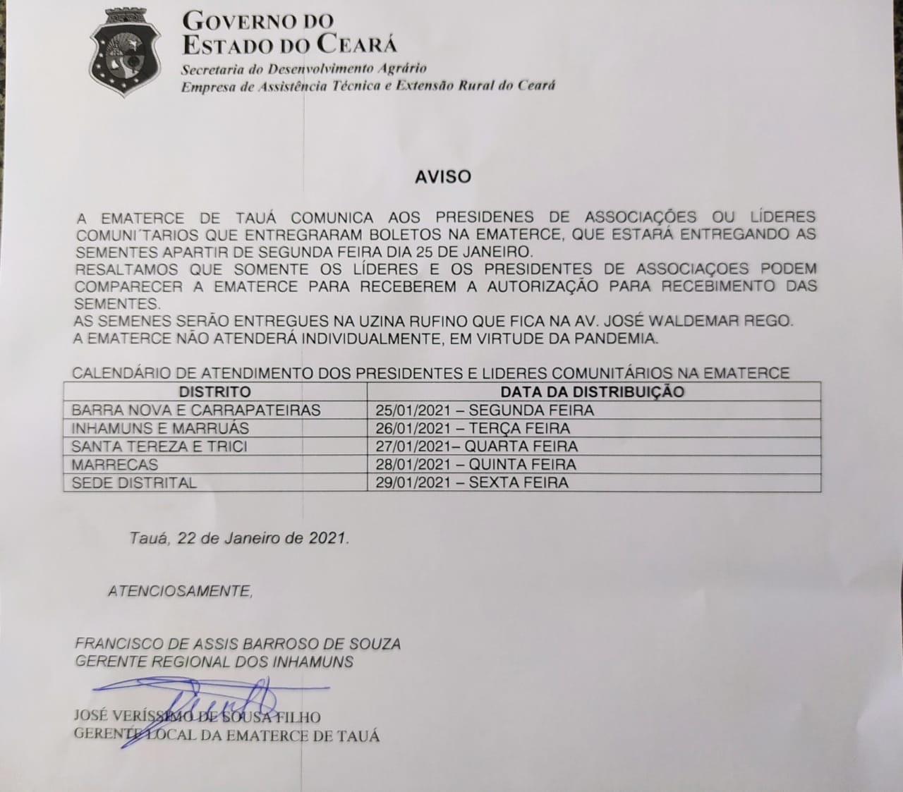O órgão responsável pela entrega da semente orienta que somente os líderes comunitários ou presidentes de associações compareçam para o recebimentodo Boletim de Movimento(BM). Em seguida, deverão se dirigir até a Usina Rufino onde a semente será distribuída.