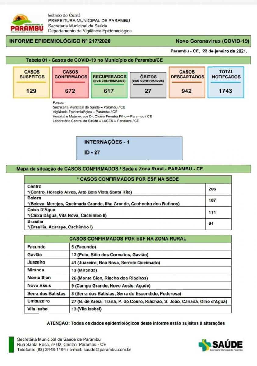 Boletim Epidemiológico divulgado no final da tarde de ontem(22), pela Secretaria de Saúde, confirmou o 27º óbito por coronavírus no Município de Parambu.