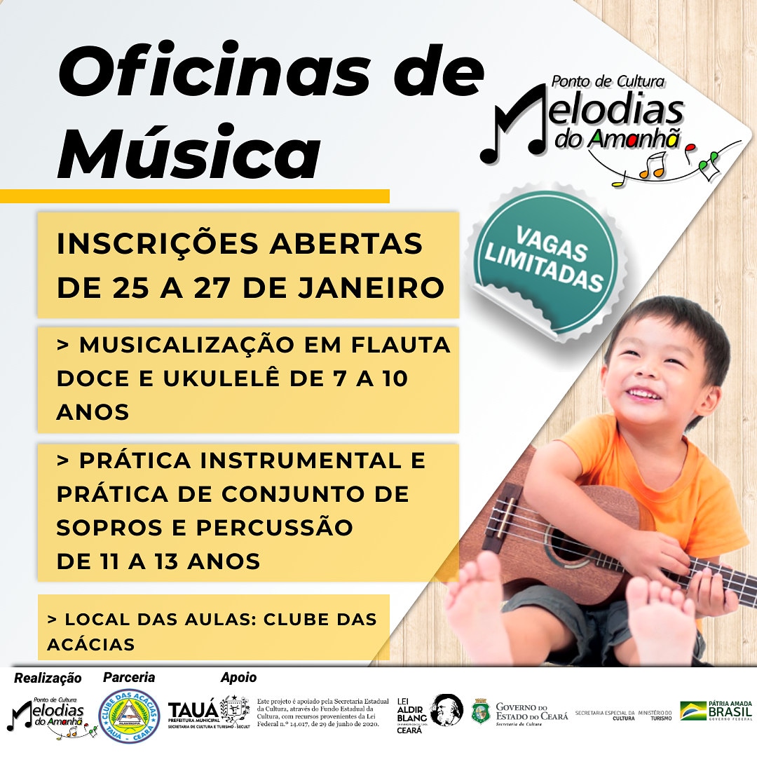 O Projeto Melodias do Amanhã abre inscrições no período de 25 a 27 de janeiro para Oficinas de Música no Município de Tauá.