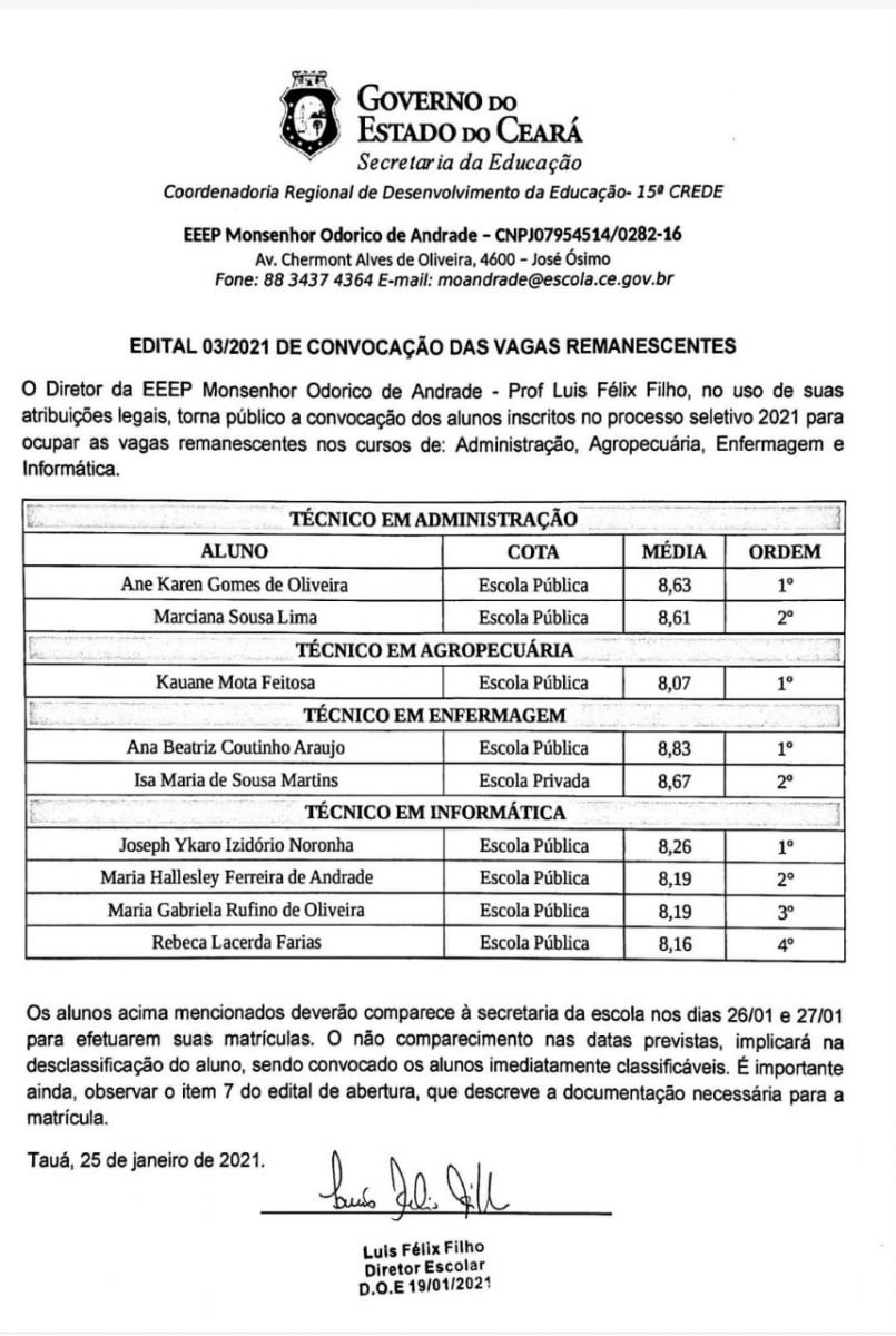 Na manhã de hoje(25), a Escola Profissional Monsenhor Odorico de Andrade, em Tauá, divulgou Edital de Convocação de alunos para ocuparem vagas remanescentes para o ano letivo de 2021.