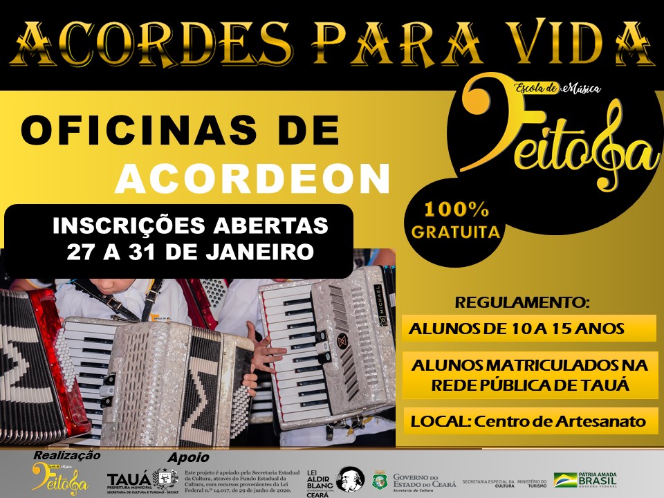 A Escola de Música Feitosa está com inscrições abertas até o dia 31 de janeiro para a realização de Oficinas de Acordeon no município de Tauá. Podem se inscreverem crianças na faixa etária de 10 a 15 anos, que estejam matriculadas na rede pública de ensino de Tauá.