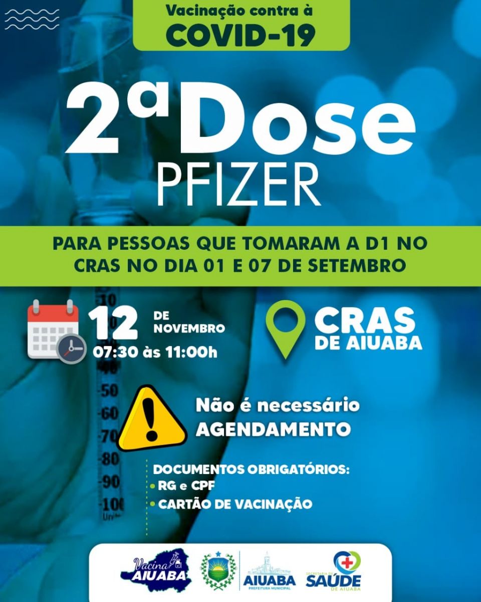A Secretaria de Saúde de Aiuaba marcou para sexta-feira(12), a aplicação da segunda dose da vacina Pfizer contra a Covid-19, para quem tomou a D1 nos dias 1º e 7 de setembro.