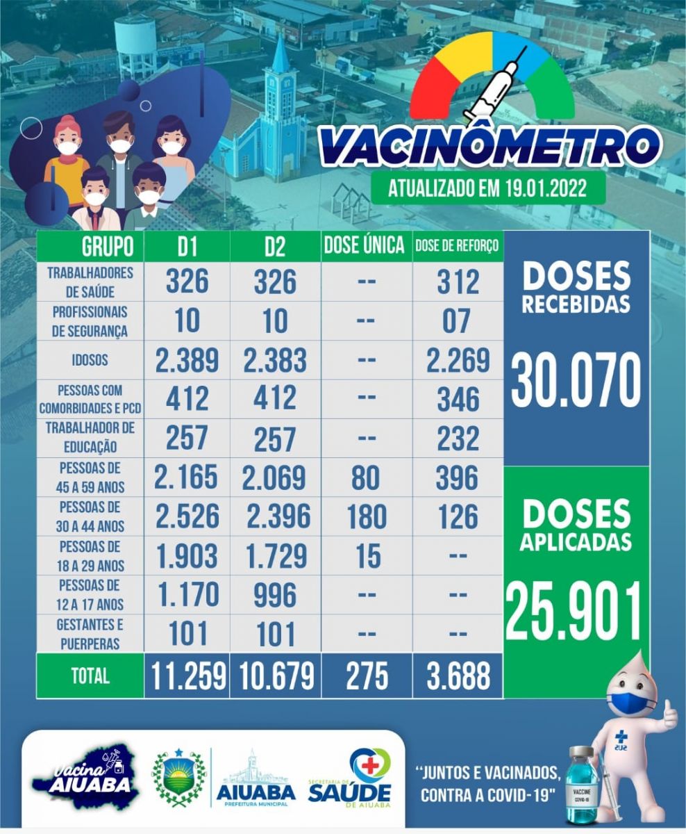 Quase 26 mil doses de vacinas foram aplicadas pela Secretaria de Saúde do Município de Aiuaba, desde o início da campanha há cerca de um ano, Os números do Vacinômetro foram atualizados nesta quarta-feira (19).