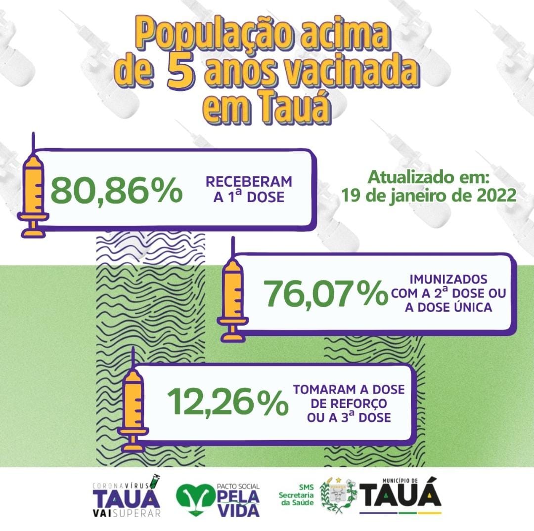 O município de Tauá atualizou hoje(19), o andamento da campanha de vacinação contra a Covid-19, iniciada há cerca de um ano. Mais de 93% das vacinas recebidas estão nos braços da população a partir dos 12 anos de idade.