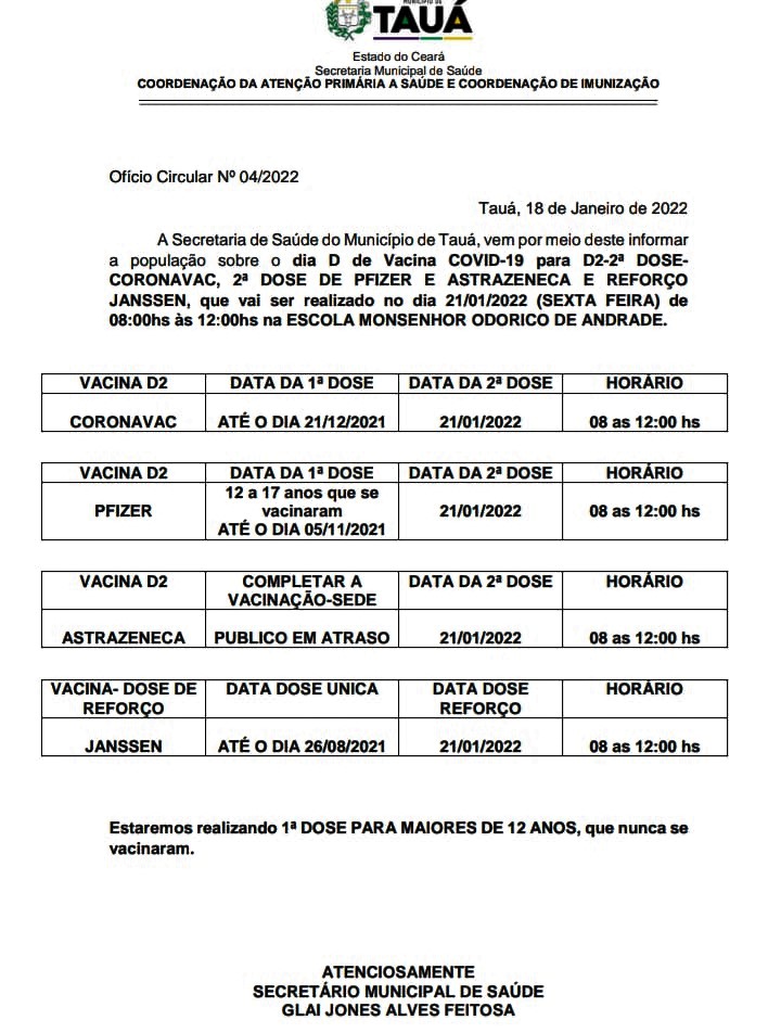 A Secretaria de Saúde do município de Tauá realizará na sexta-feira (21), mais um Dia D de vacinação contra a Covid-19. O atendimento acontecerá no horário de 8h às 12h, na Escola Profissional Monsenhor Odorico de Andrade.