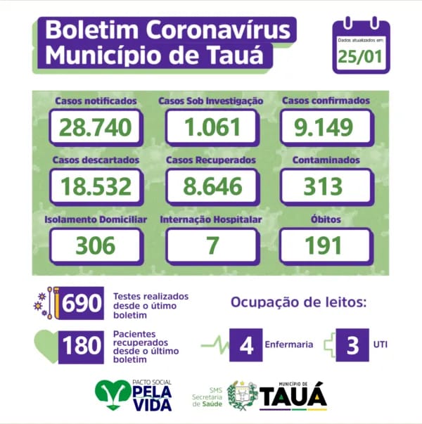 Já a Enfermaria-Covid teve a taxa reduzida para 25%, com 07 tauaenses hospitalizados, sendo 3 adultos e 2 crianças.