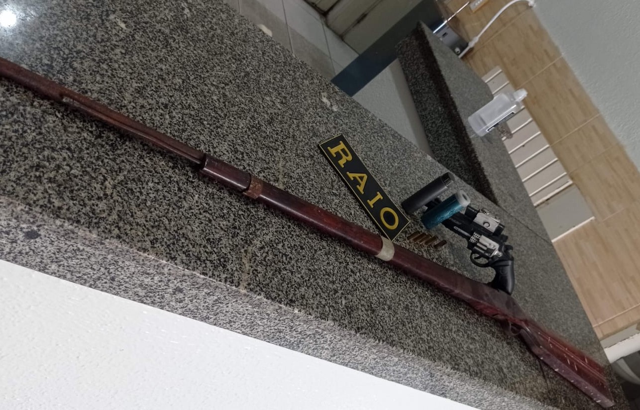 Policiais do CPRaio de Tauá apreenderam hoje (05), uma espingarda e um simulacro de revólver na vila de Guaribas, distrito de Marruás, após denúncias sobre disparos de arma de fogo efetuados na noite de ontem (04), por um homem identificado apenas pelo nome de Gilvan.
