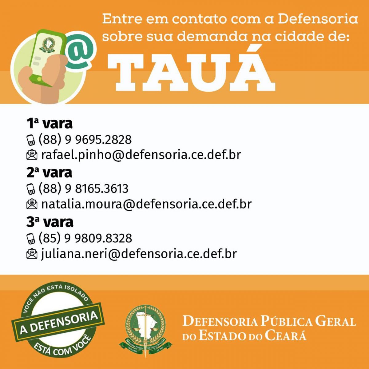 A Dra. Juliana Neri disse ao Blog do Wilrismar que "em razão da pandemia do novo coronavírus, a Defensoria Pública de Tauá vem realizando os atendimentos através de telefone, whatsapp e e-mail. Se você necessita de qualquer esclarecimento, seja a respeito de processos já em andamento, seja para ingressar com novas demandas judiciais, basta entrar em contato conosco que faremos a análise da viabilidade do seu pedido".